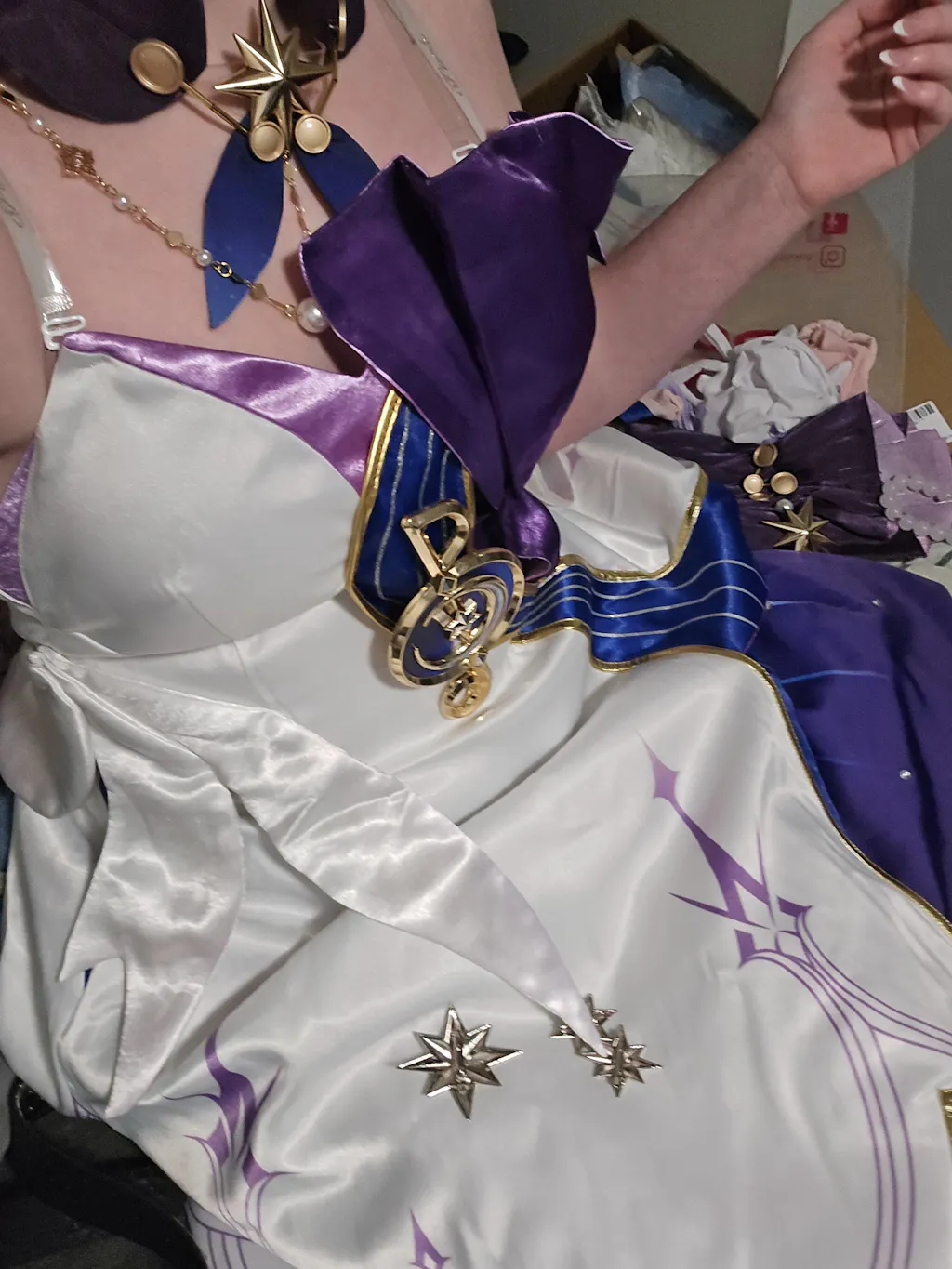 2.Full Set=Dress + Half Dress + Neckpiece (with shoulder chain) + Sleeves + Gloves + Flutter Decoration + Head Fin + Headpiece + Ear Clips + Strings + Note Decoration